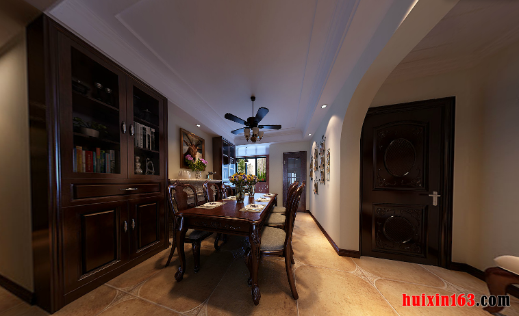 本套为美式风格装修,客厅地面采用的是大理石装修,局部采用的是地毯进行装饰,墙面采用的白色的乳胶漆进行装修,吊顶采用石膏板进行平顶吊顶,通过石膏板吊顶能够让自己的居室显示出更多的温馨色彩,具有质轻、防潮、不变形等特点,并且施工方便,家具特别舒适、气派、实用和多功能。电视背景墙采用拱形的形状搭配壁纸,迷人之处在于造型的设计,看上去非常的雅致,电视两边墙面同时也采用了壁纸粘贴,既耐用其中美丽的花型图案对墙面起到了一个装饰的作用,整体给人以雍雅华贵的气息。