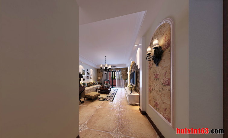 本套为美式风格装修,客厅地面采用的是大理石装修,局部采用的是地毯进行装饰,墙面采用的白色的乳胶漆进行装修,吊顶采用石膏板进行平顶吊顶,通过石膏板吊顶能够让自己的居室显示出更多的温馨色彩,具有质轻、防潮、不变形等特点,并且施工方便,家具特别舒适、气派、实用和多功能。电视背景墙采用拱形的形状搭配壁纸,迷人之处在于造型的设计,看上去非常的雅致,电视两边墙面同时也采用了壁纸粘贴,既耐用其中美丽的花型图案对墙面起到了一个装饰的作用,整体给人以雍雅华贵的气息。