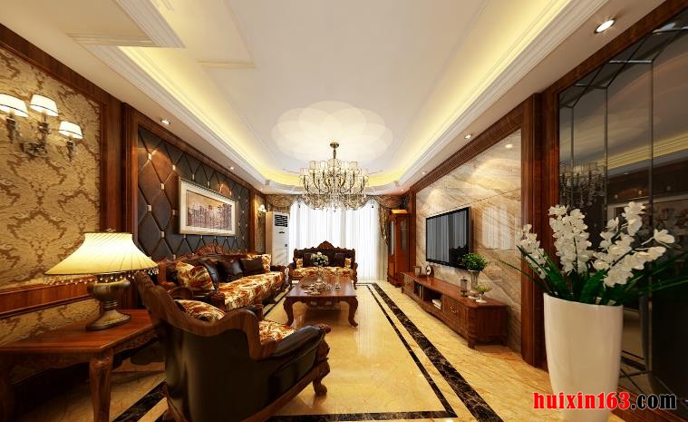 石膏装饰工艺打造的客厅吊顶,曲线与直线的完美结合,赋予吊顶新的美感,四周边幅修饰,增加了层次感,水晶大吊灯置于吊顶中央,华美亮丽,晶莹闪耀。花纹墙砖贴饰而成的电视背景墙,实木线收边,实木美式电视柜搭配,整体感觉高贵大气。大理石拼花地板,造型优雅的实木茶几,弧度曲线桌腿设计,保留了木材原有的纹理与质感,质朴自然。实木结构花纹布艺沙发,天然木材的自然纹理,适当的雕花装饰,深棕色皮质靠枕装饰,体态沉稳庄重,古朴典雅,展现出来美式风格的粗犷、不做作。软包沙发背景墙设计,深咖色与家居整体的设计风格相适应,装饰画点缀。整个家居设计给人格调高雅、舒适随意的感觉。